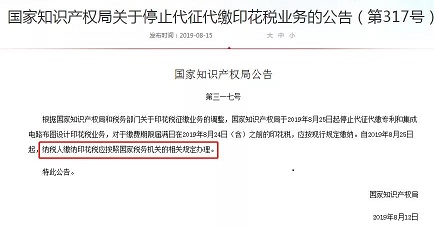 自2019年8月25日起,國知局停止代征代繳印花稅業(yè)務(wù),納稅人繳納印花稅應(yīng)按照國家稅務(wù)機(jī)關(guān)的相關(guān)規(guī)定辦理。