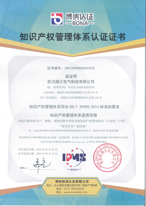 熱烈祝賀武漢騰江電氣制造有限公司于2019年9月獲得知識(shí)產(chǎn)權(quán)貫標(biāo)認(rèn)證證書(shū),這意味著騰江電氣在知識(shí)產(chǎn)權(quán)領(lǐng)域獲得到重要認(rèn)可,在知識(shí)產(chǎn)權(quán)方面得到進(jìn)一步規(guī)范和在綜合競(jìng)爭(zhēng)力得到進(jìn)一步提升。
