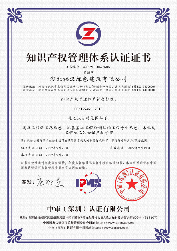 熱烈祝賀湖北福漢綠色建筑有限公司于2019年9月獲得知識產(chǎn)權(quán)貫標認證證書,這意味著福漢綠色在知識產(chǎn)權(quán)領(lǐng)域獲得到重要認可,在知識產(chǎn)權(quán)方面得到進一步規(guī)范和在綜合競爭力得到進一步提升。